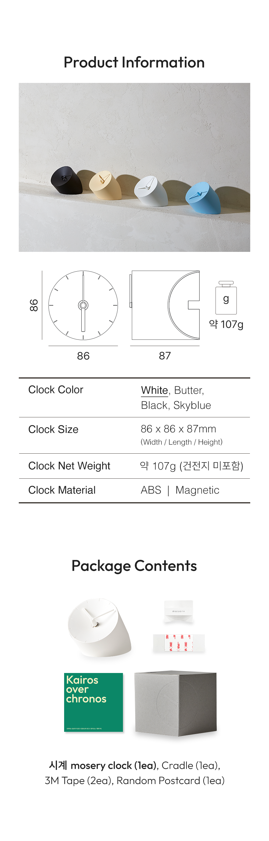 모서리 시계 (1ea), 모서리용 크래들 (1ea), 3M 테이프 (4ea), 랜덤 포스터카드 (1ea)